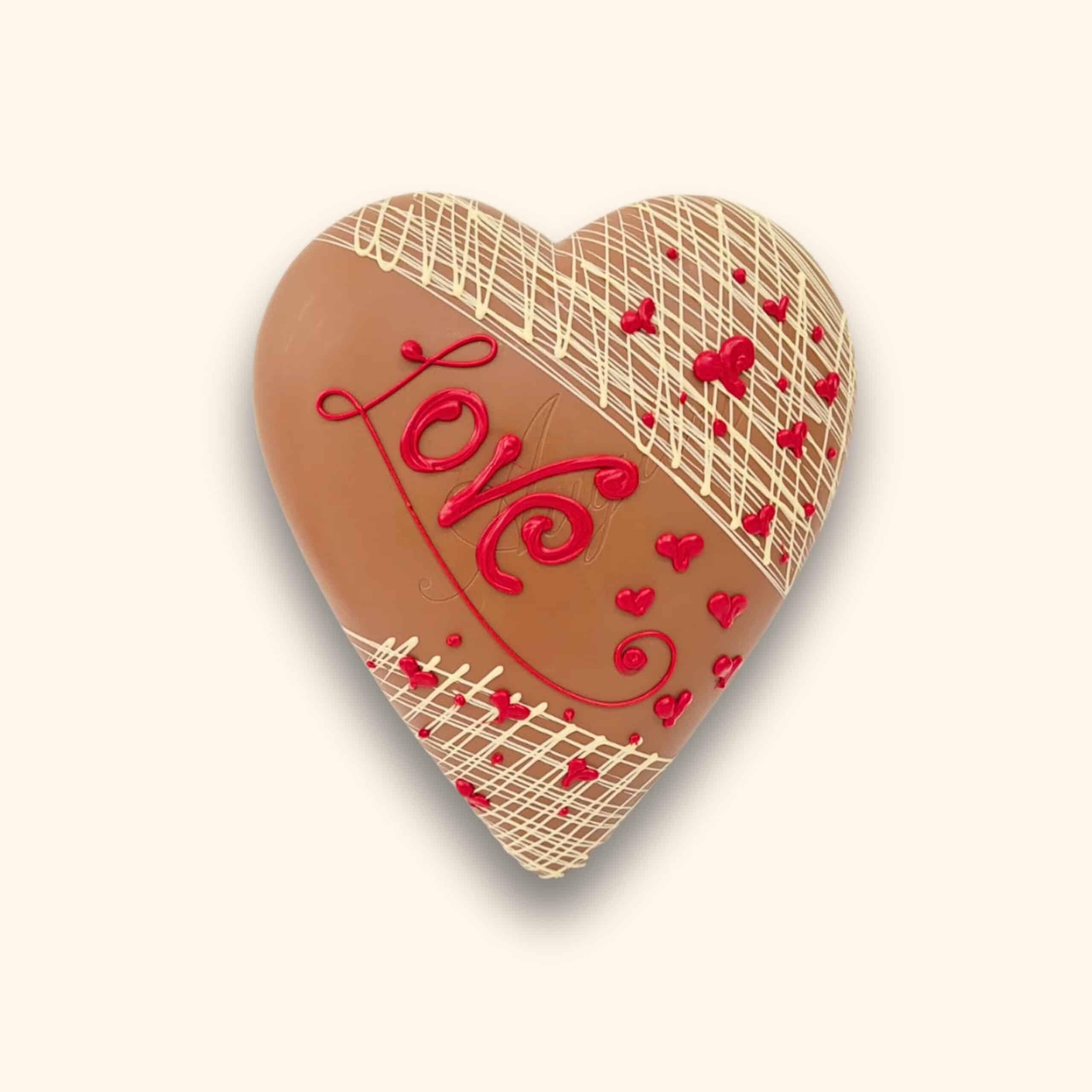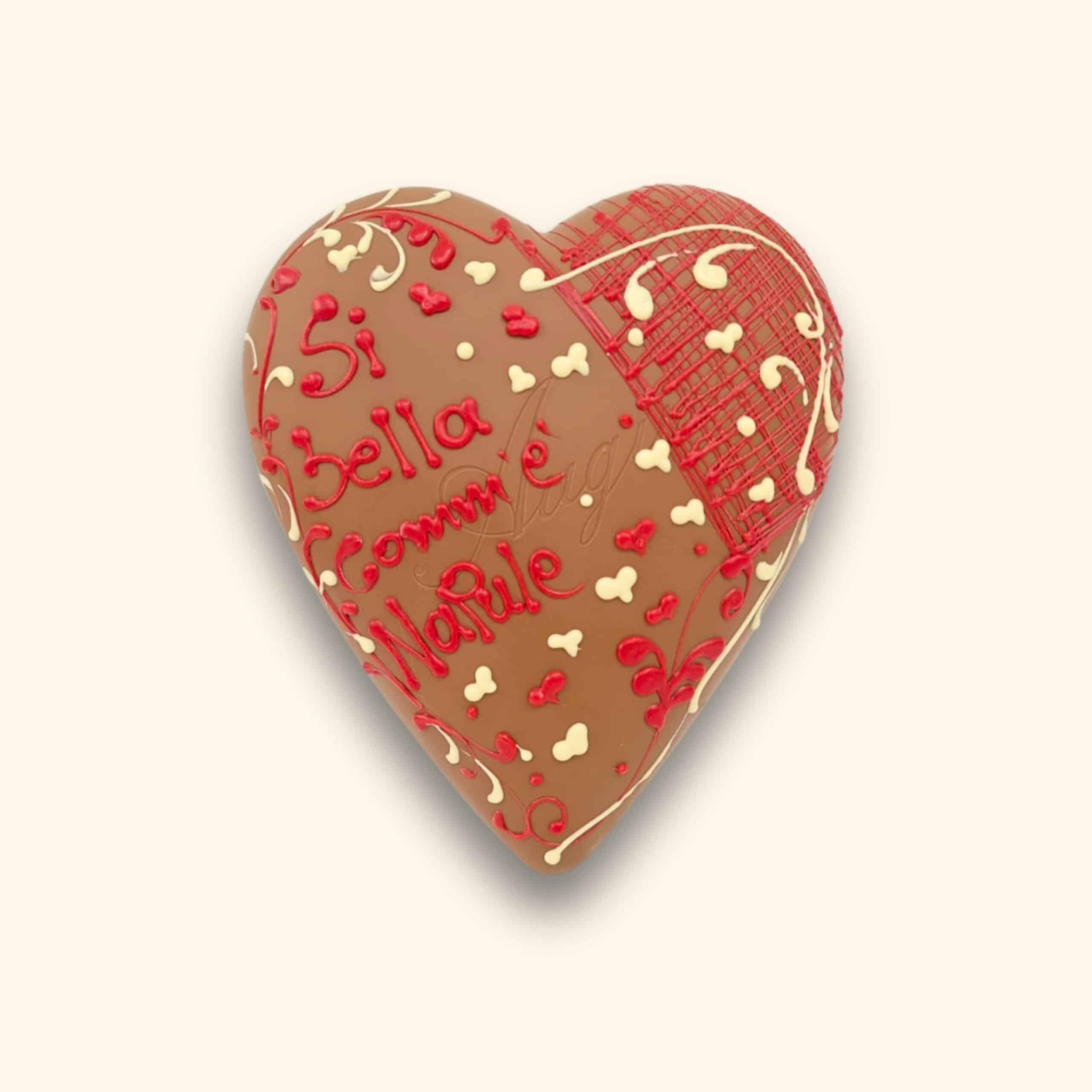 Cuore di cioccolato al latte artigianale 750 g, decorato a mano. Edizione limitata San Valentino 2026 (scritta “LOVE” o “Si bella comme Napule”).