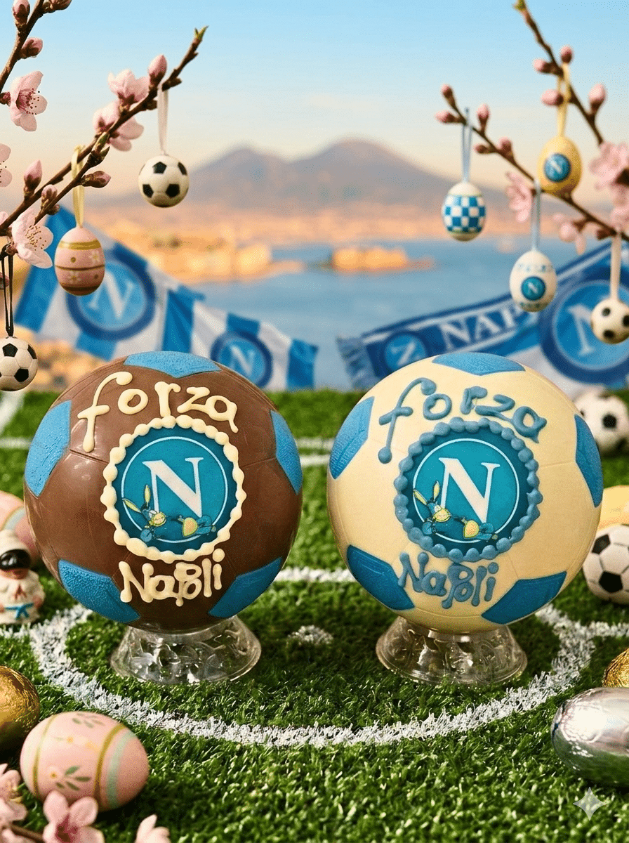 Festeggia la Pasqua con l’emozione del grande calcio. Il nostro Pallone Napoli da 750g è una creazione esclusiva della nostra pasticceria artigianale, pensata per unire la fede calcistica all’eccellenza del vero cioccolato italiano. Con uno sfondo che richiama l’incanto del Golfo e del Vesuvio, questo prodotto non è solo un dolce, ma un omaggio alla nostra terra.