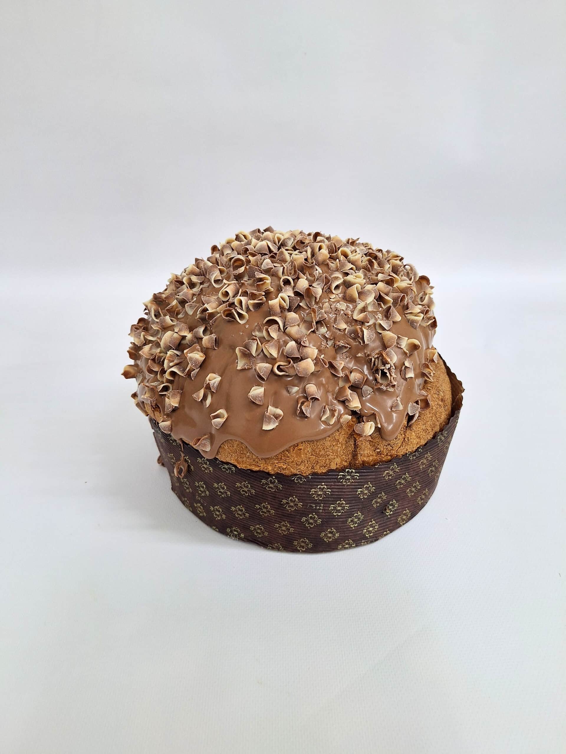 Farcito con Nutella e decorato con cioccolato al latte e riccioli di cioccolato, è il panettone artigianale ideale per il Natale.
