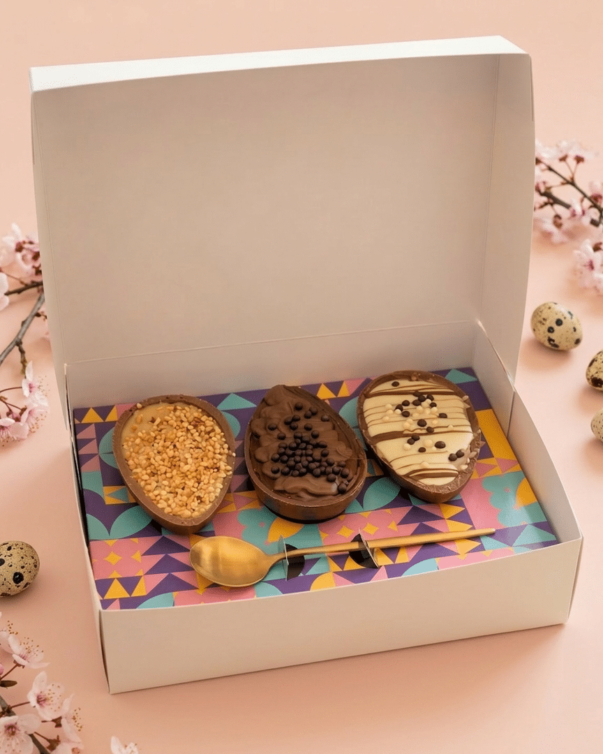 Perché sceglierne uno quando puoi provarli tutti? Il nostro Trio al Cucchiaio è un percorso degustazione racchiuso in tre scrigni di cioccolato. Tre mezzi gusci artigianali con farciture vellutate e guarnizioni gourmet, accompagnati da un elegante cucchiaino dorato. Il regalo perfetto per chi ama perdersi nella cremosità più assoluta.