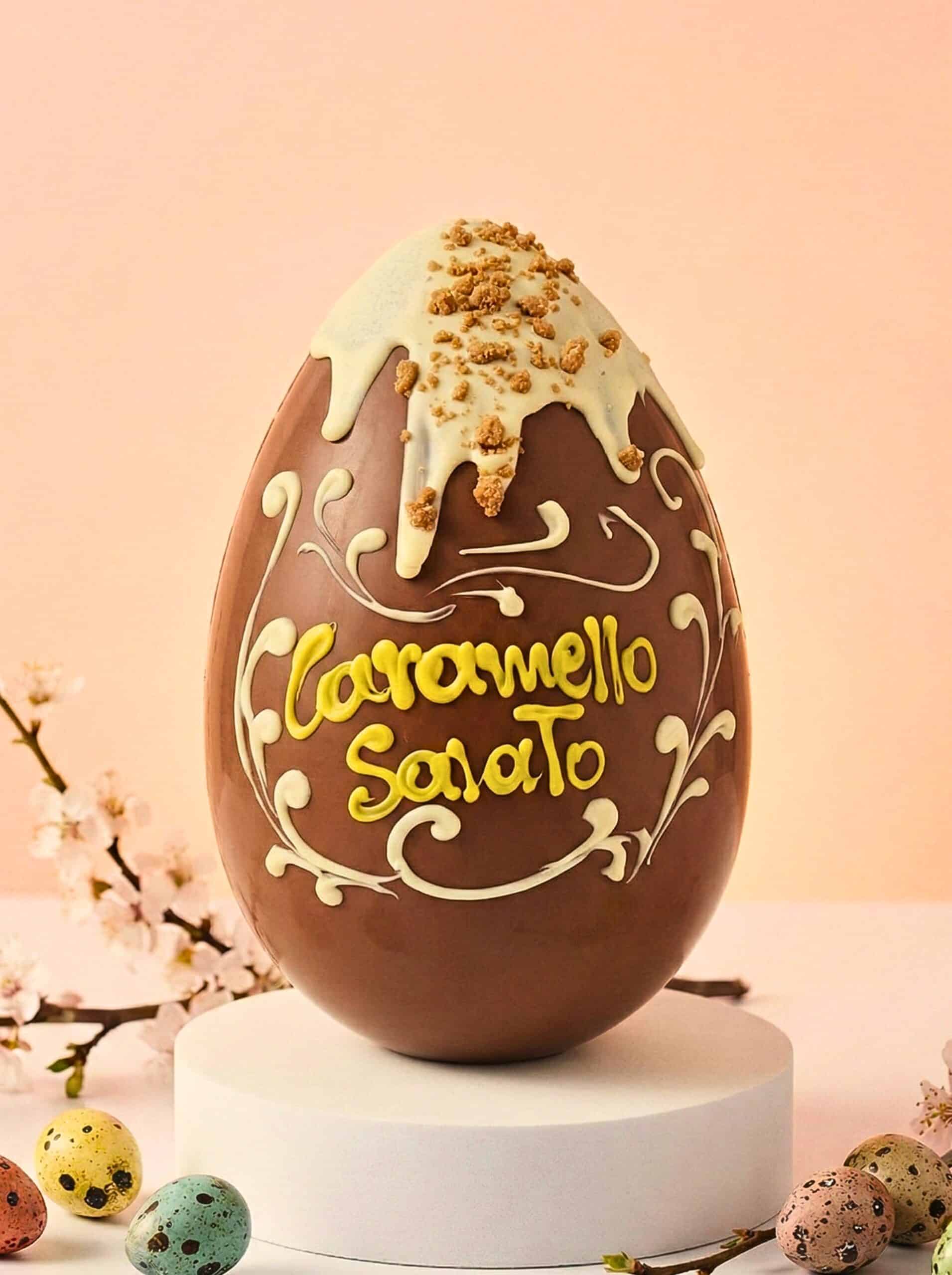 Un’Opera d’Arte Fatta a Mano Ogni Uovo al Caramello Salato è decorato a mano dai nostri maestri cioccolatieri. La golosa colata alla sommità è arricchita da una pioggia di granella croccante che dona consistenza, mentre i delicati arabeschi bianchi e la vivace scritta “Caramello Salato” in giallo vengono realizzati con sapiente uso della sac à poche, rendendo ogni uovo un pezzo unico e inimitabile.