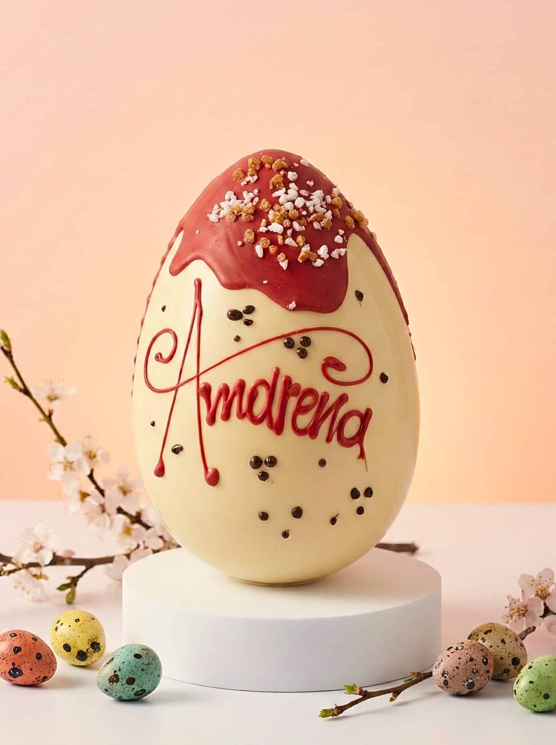 L’Arte del Fatto a Mano Ogni Uovo “Cuore di Amarena” è un pezzo unico. Non utilizziamo macchinari industriali: la colata colorata, l’applicazione della granella e l’elegante scritta in corsivo sono realizzate a mano, uovo dopo uovo, con sac à poche e tanta passione artigianale.