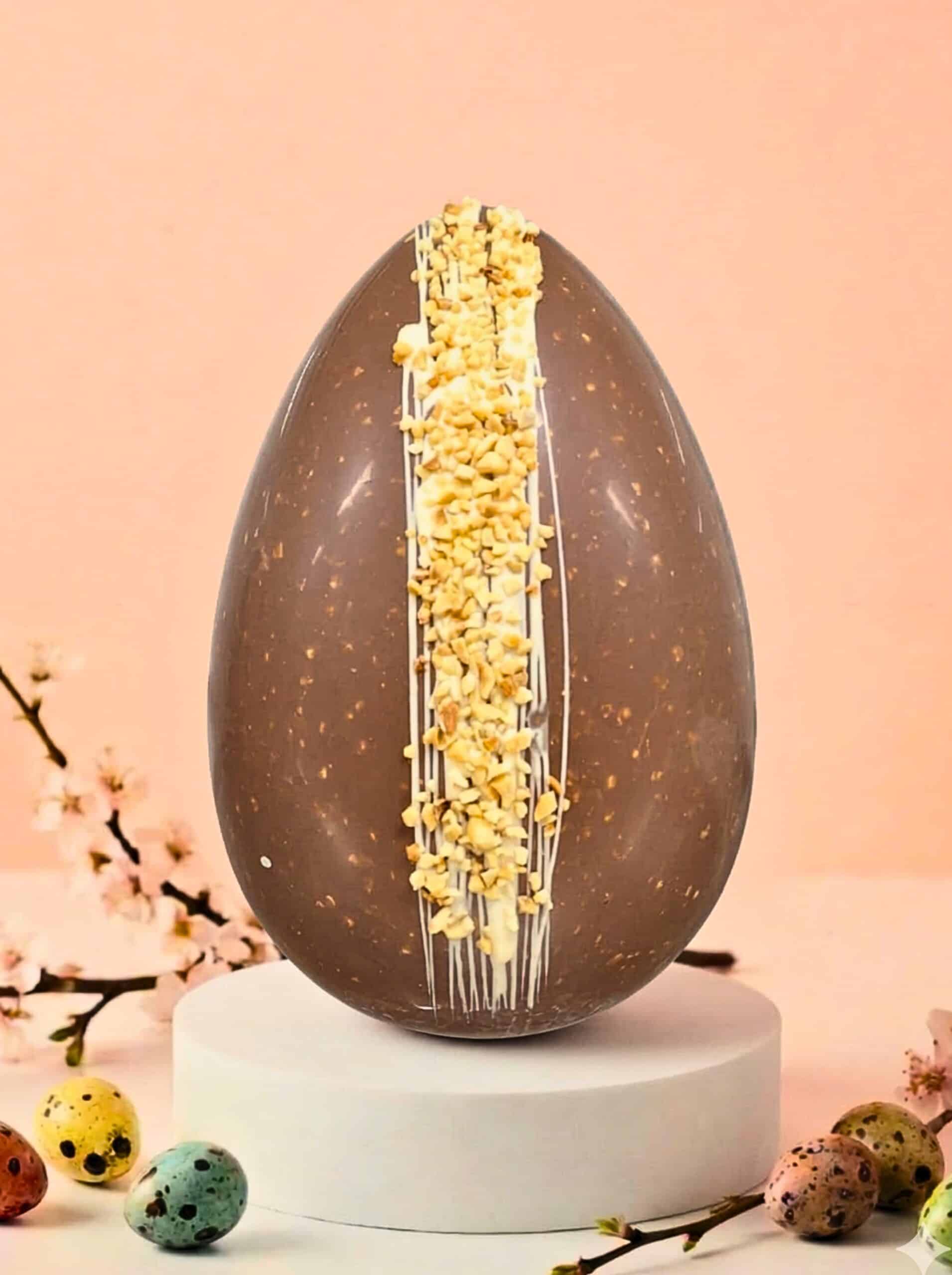 Un’esperienza sensoriale avvolgente che celebra l’unione perfetta tra il cremoso cioccolato gianduia e la croccantezza delle nocciole. Questo uovo artigianale da 550g si distingue per un’elegante colata centrale di cioccolato bianco, impreziosita da una pioggia generosa di granella di nocciole tostata. Il dono perfetto per chi cerca l’eleganza nel gusto.